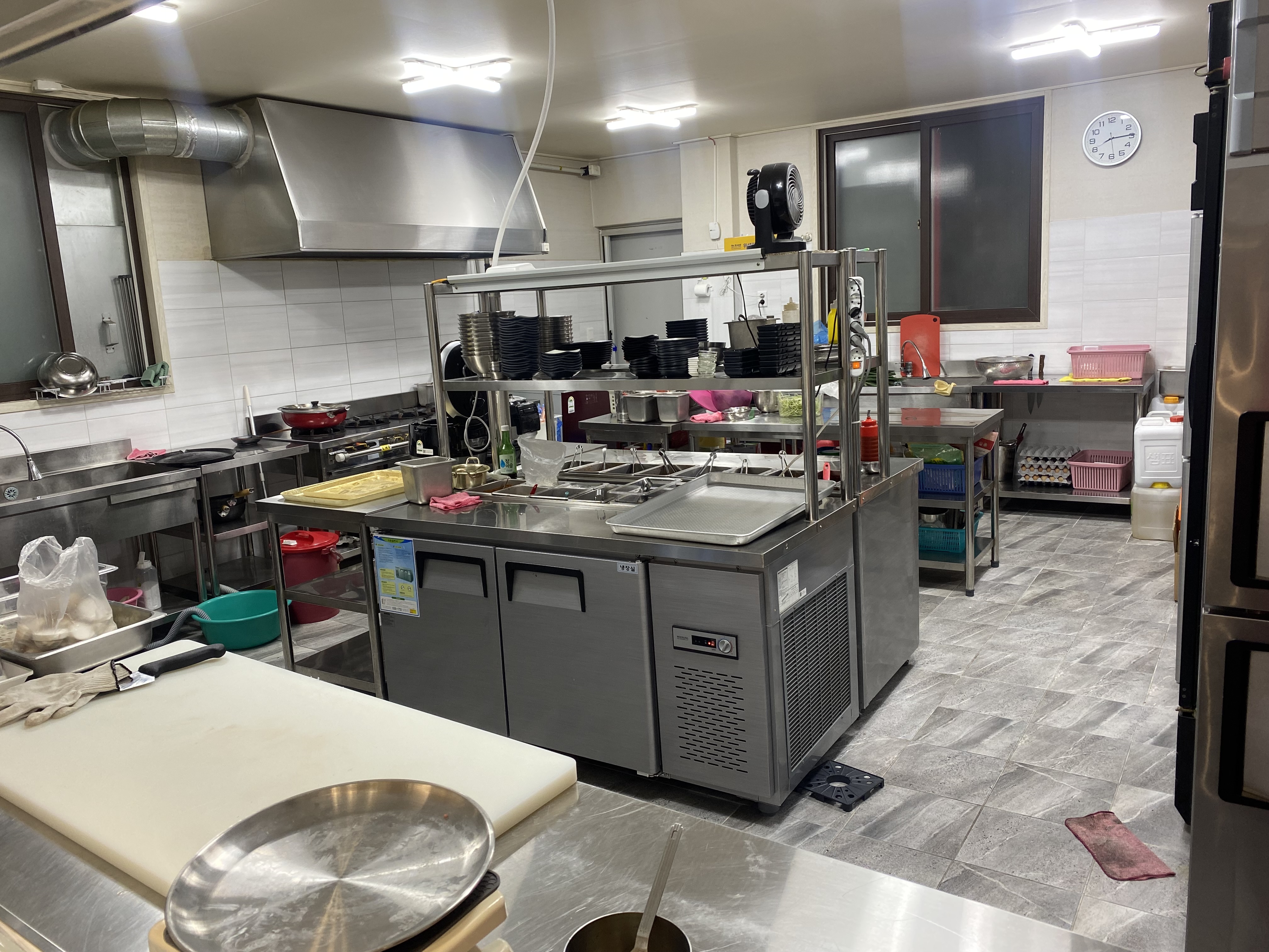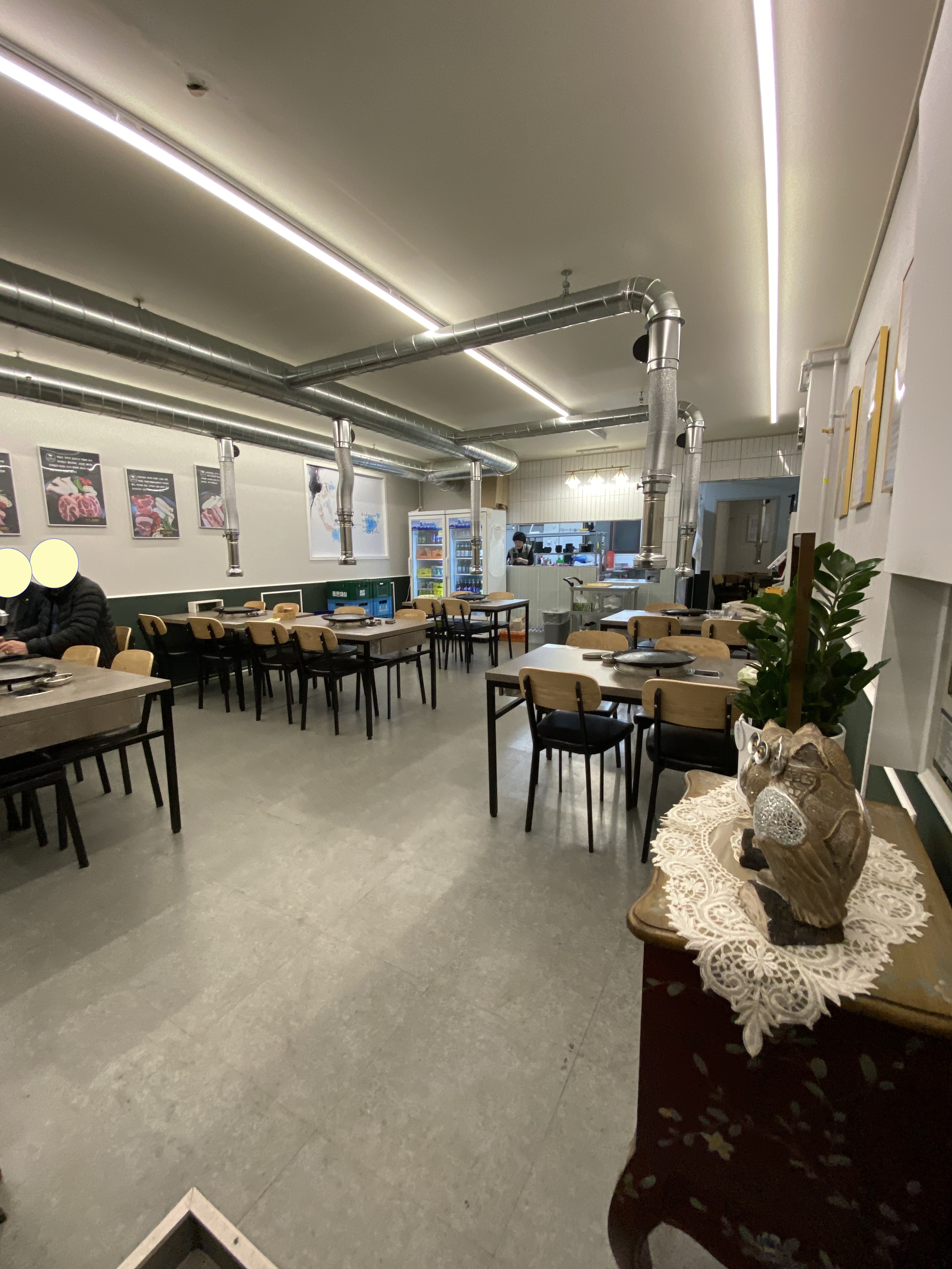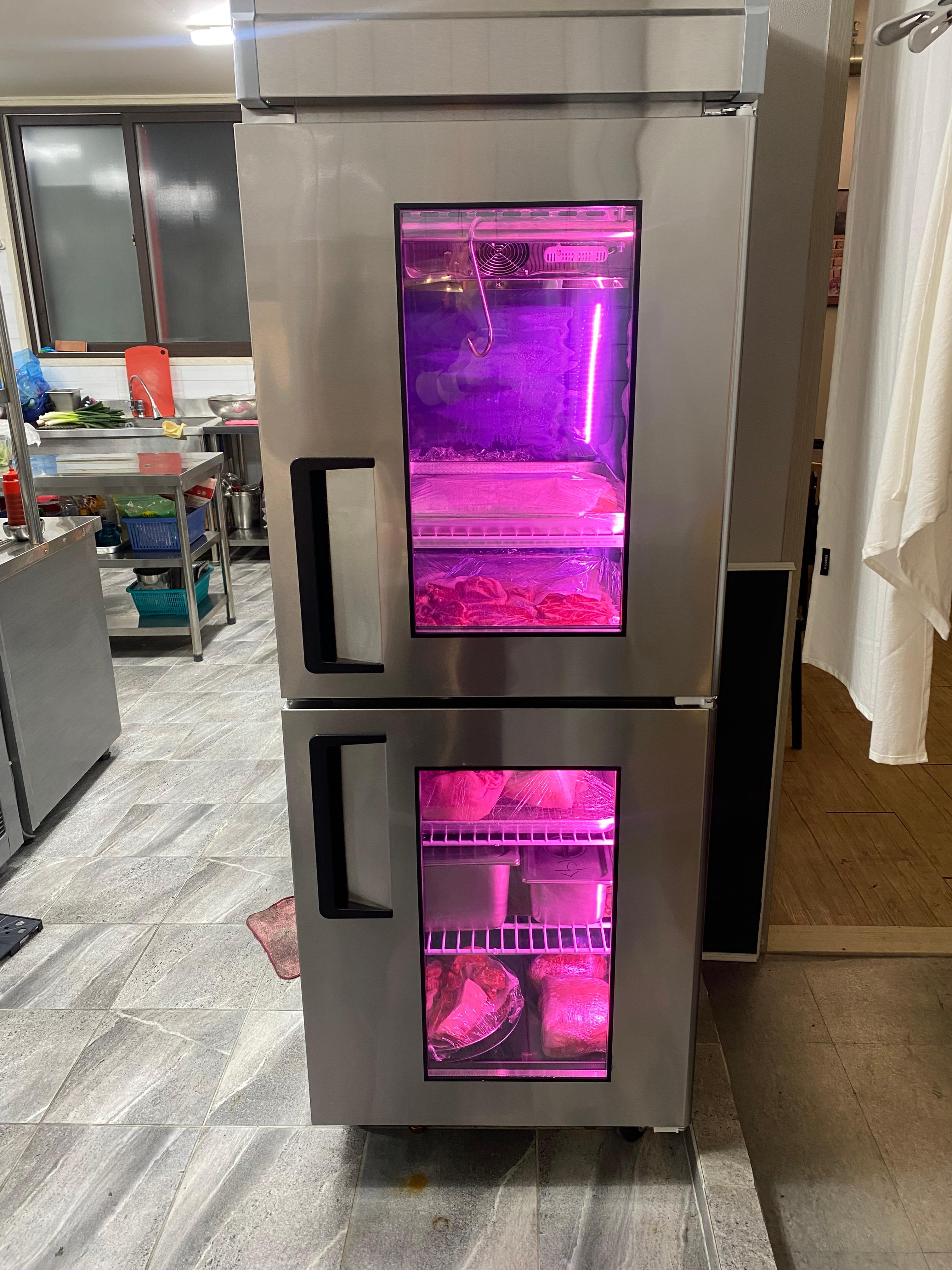 깨끗한 내부에는 홀과 주방이 탁 트여서 모든 것을 다 볼 수 있게 되어 있고 숙성 중인 돼지고기 냉장고가 한눈에 딱 들어옵니다.