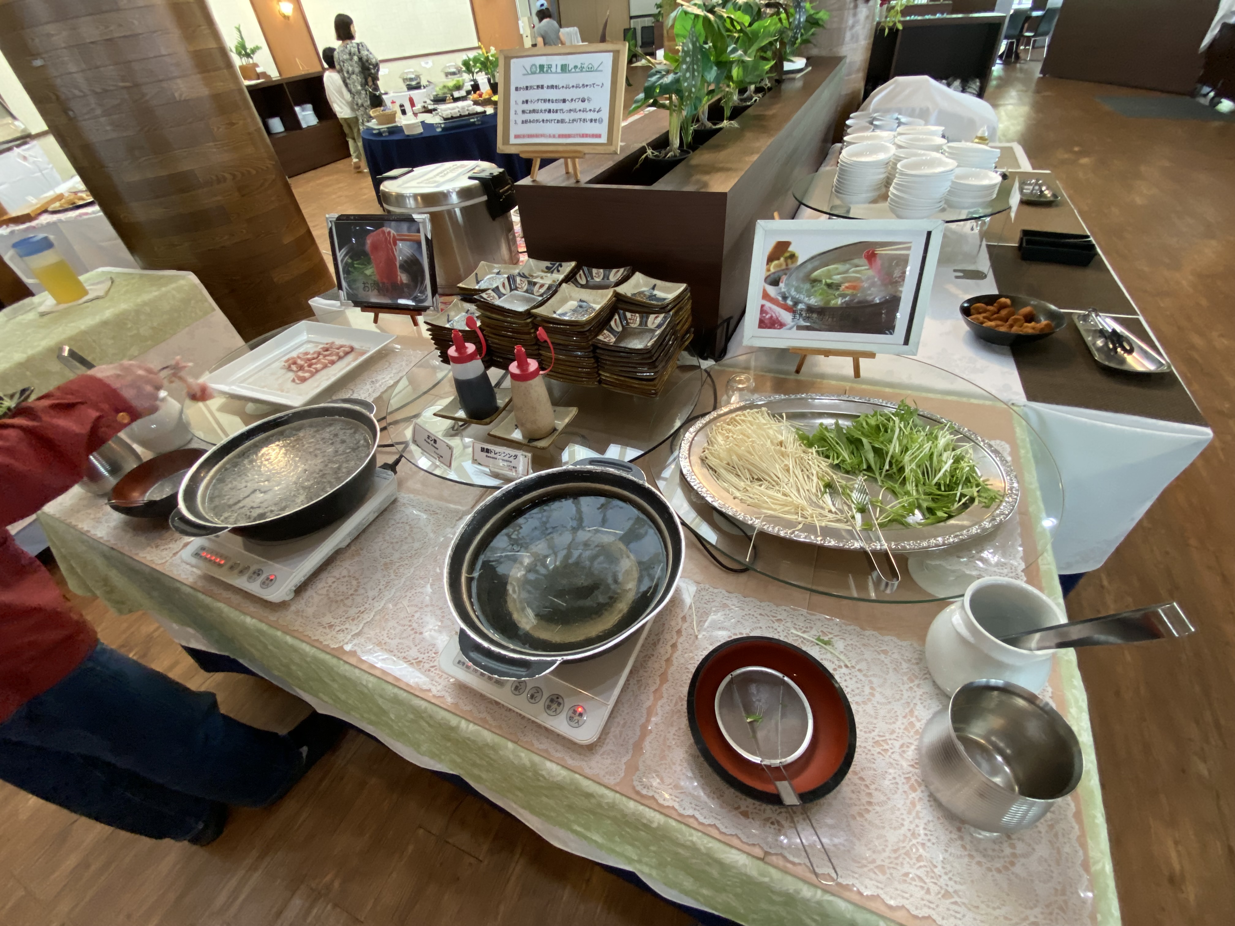 디저트 코너가 눈에 먼저 들어와서 시루떡 같은 일본 스타일 모찌와 한입 도넛이 있었고, 샤브샤브였나? 그런 것도 있습니다. 모찌가 진짜 한국 시루떡과 외관으로 봤을땐 전혀 차이가 안나서 반가운 마음에 몇점 덜어왔는데 맛보고 너무 실망했습니다. 쫀득하고 찰진 그런 시루떡 맛을 예상했으나 이건 뭐..... 너무 물러서 씹는 식감도 별로고 콩고물도 별로 맛이 없어서....ㅠㅠ 아들도 시루떡 좋아하는데 한입 먹고는 바로 포기!!!
