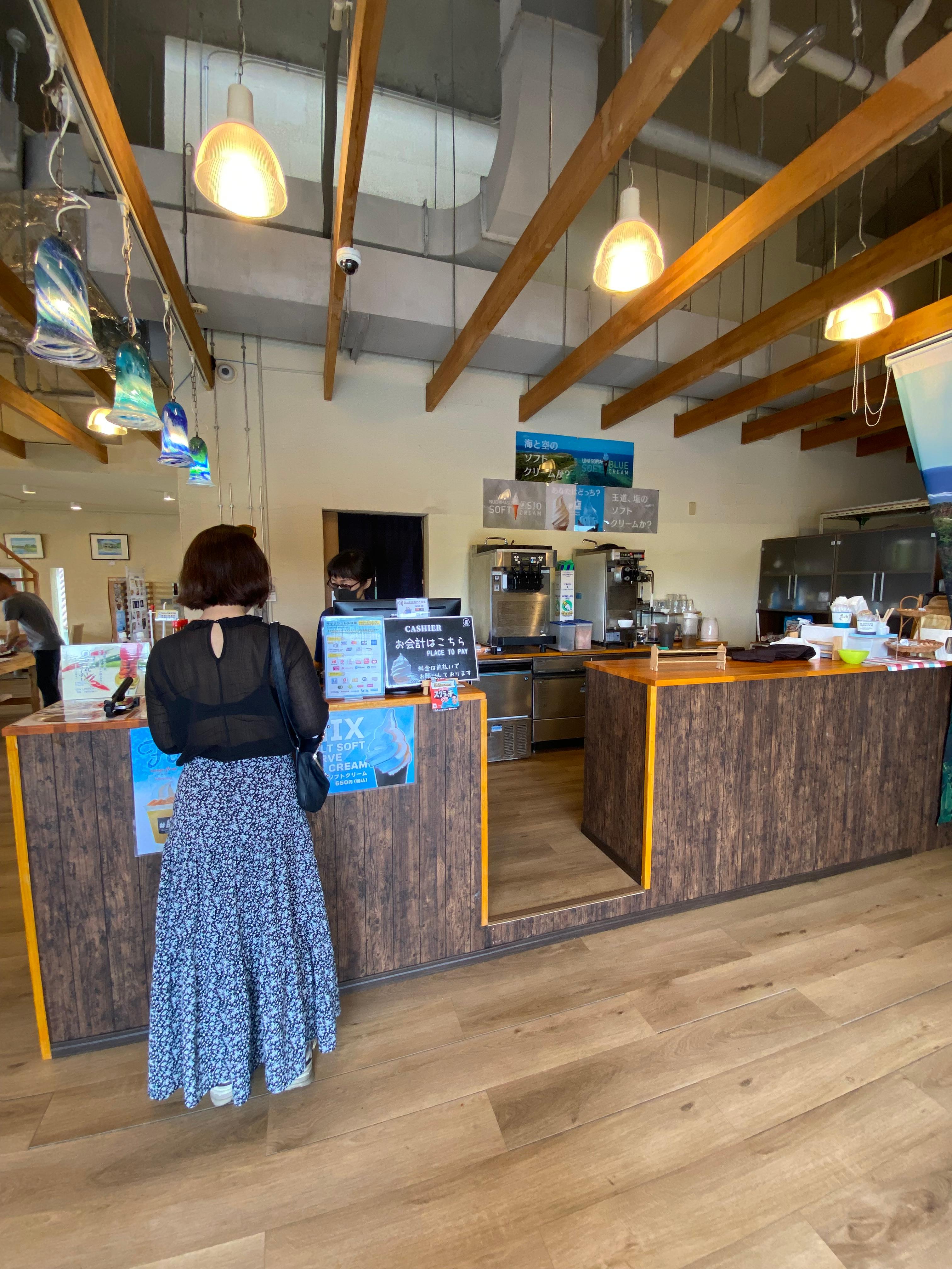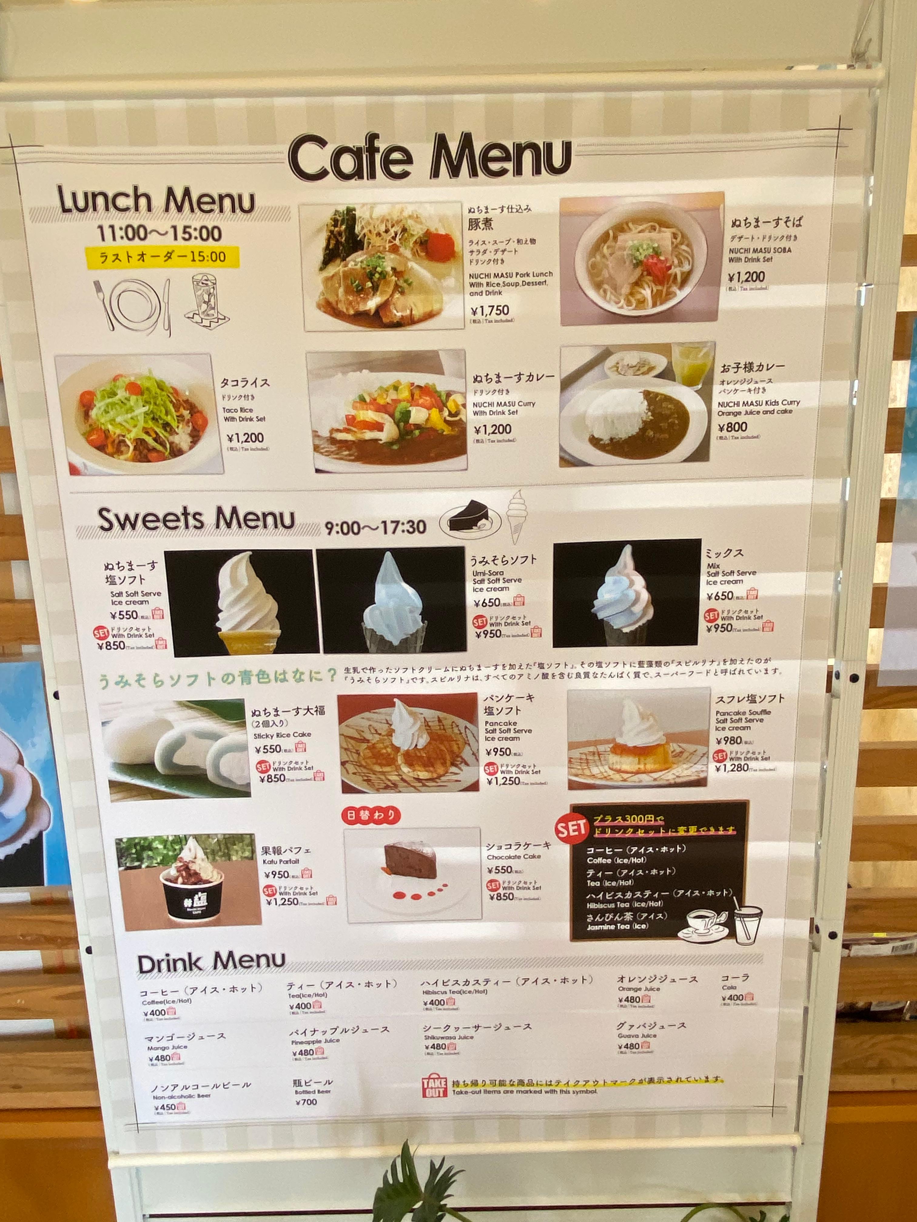 흰색이 누치마스 소금 소프트아이스크림(550엔)이고 푸른색이 우미소라 소금 소프트아이스크림(650엔)입니다. 전부 단품으로 주문했고 음료 세트로 하면 각 300엔씩 추가하면 되겠습니다.