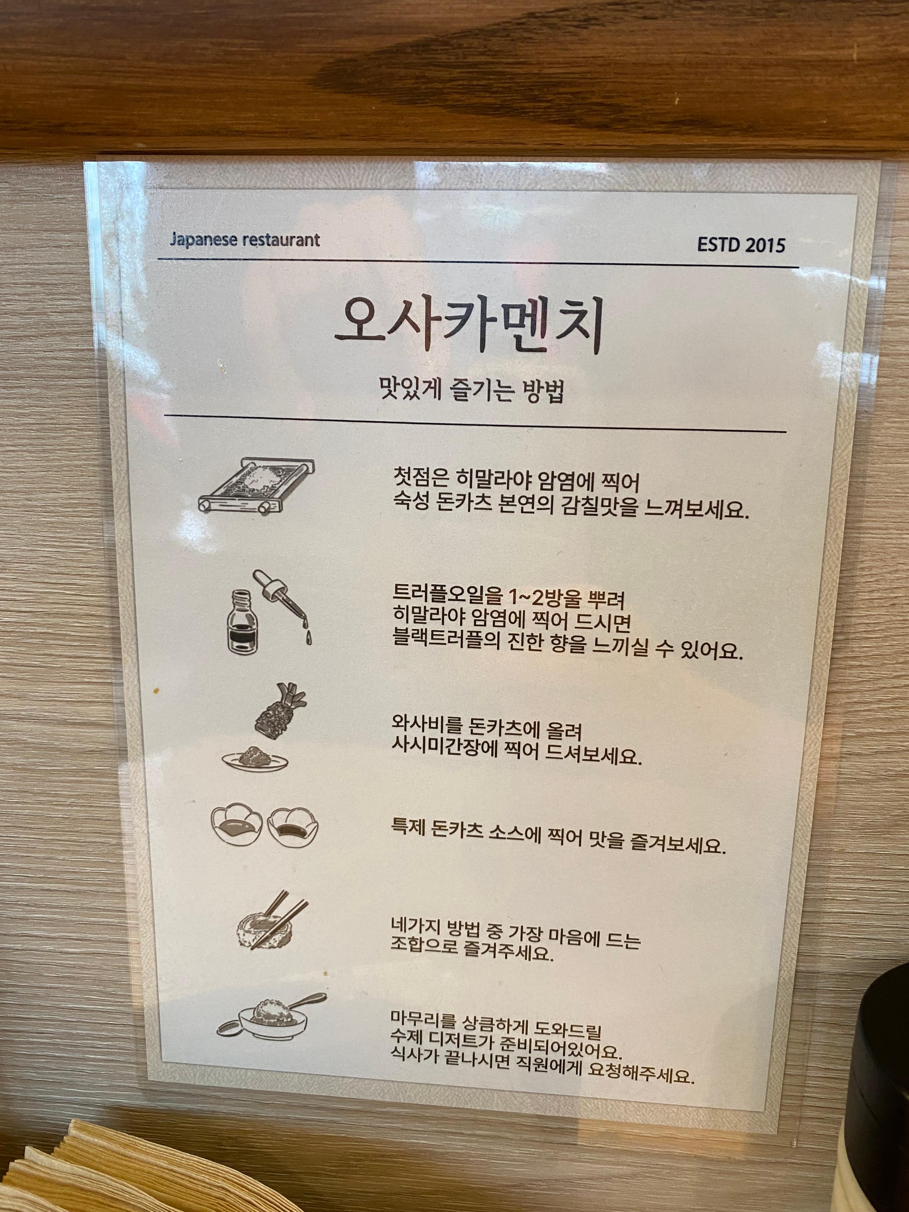카츠를 맛있게 즐기는 방법이 테이블마다 안내되어 있는데요,