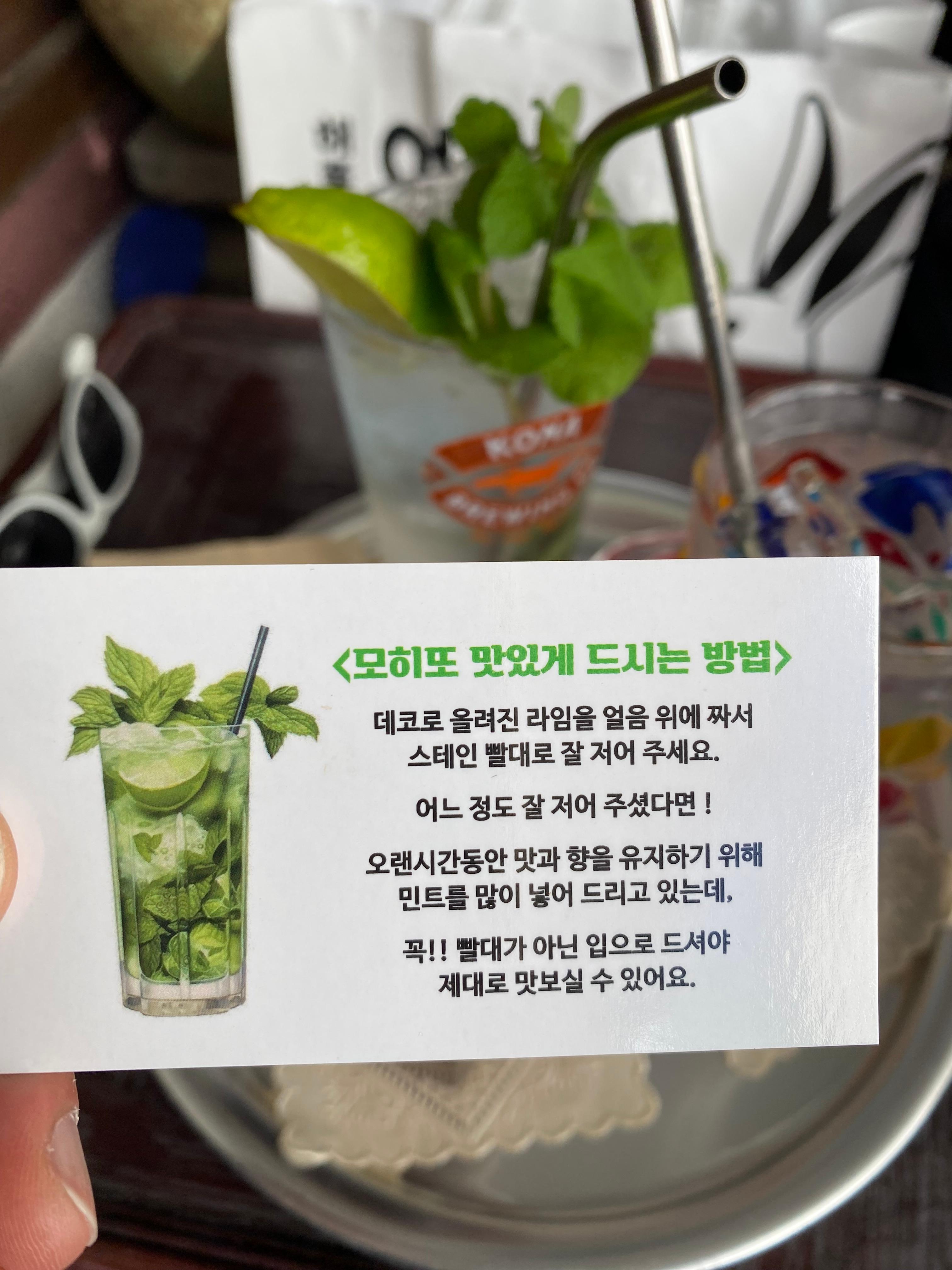 사장님께서 친히 모히또 맛있게 먹는 방법에 대해 안내 메뉴를 챙겨 주셨습니다.
