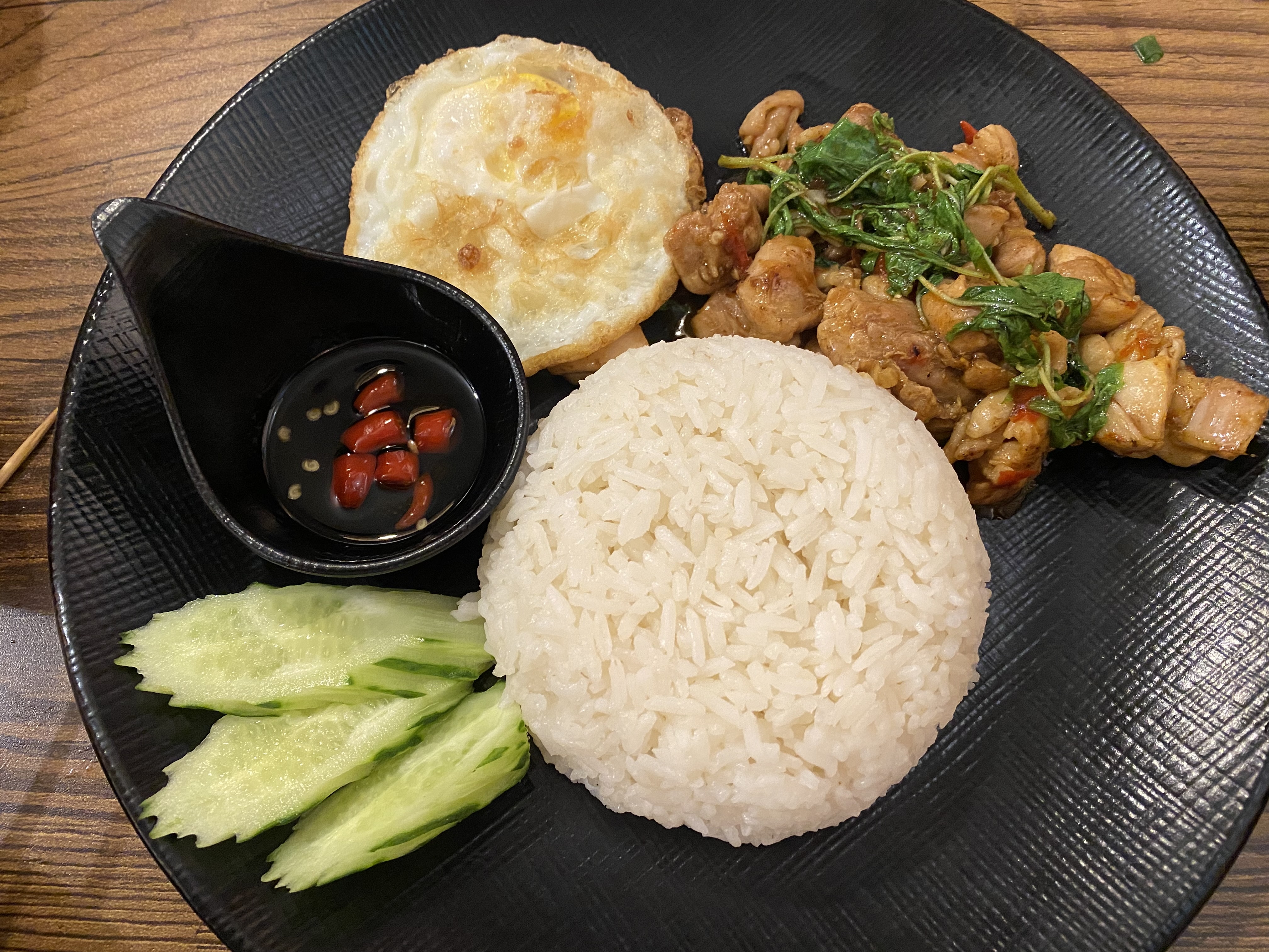 팟까파우-까이는 태국식 덮밥 같은 요리인데 닭고기덮밥이랄까요?