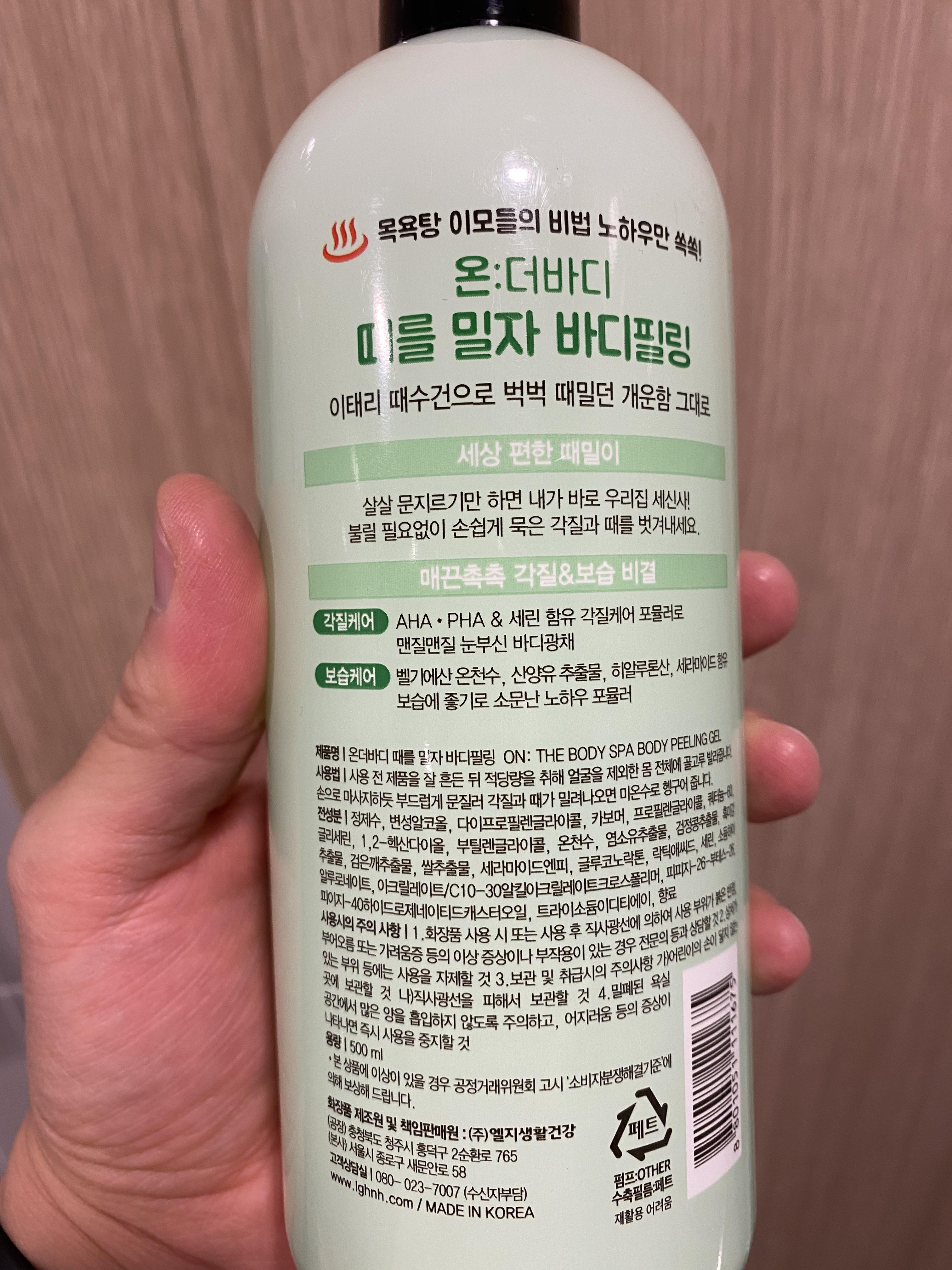 이제 본격적인 겨울철 시즌을 준비해야 할 때인 거 같습니다. 한여름 습도도 높고 땀을 많이 흘릴 때는 전혀 몰랐었는데 건조해지면서 갑자기 팔, 다리에 허옇게 각질 꽃이 피었습니다ㅠㅠ 매일 샤워타월로 밀고 보습크림을 발라줘도 역부족입니다. 할 수없이 각질 제거를 뭘로 할까 알아보다가 온더바디 제품을 구입하게 되었답니다. 상품 제목도 참 깁니다. '때를 밀자 바디필링' 이라는 제품입니다. 구입은 올리브영에서 세일 시즌 때 구입한 거라 8~9천 원 언저리에서 결제를 한 기억이 ~~