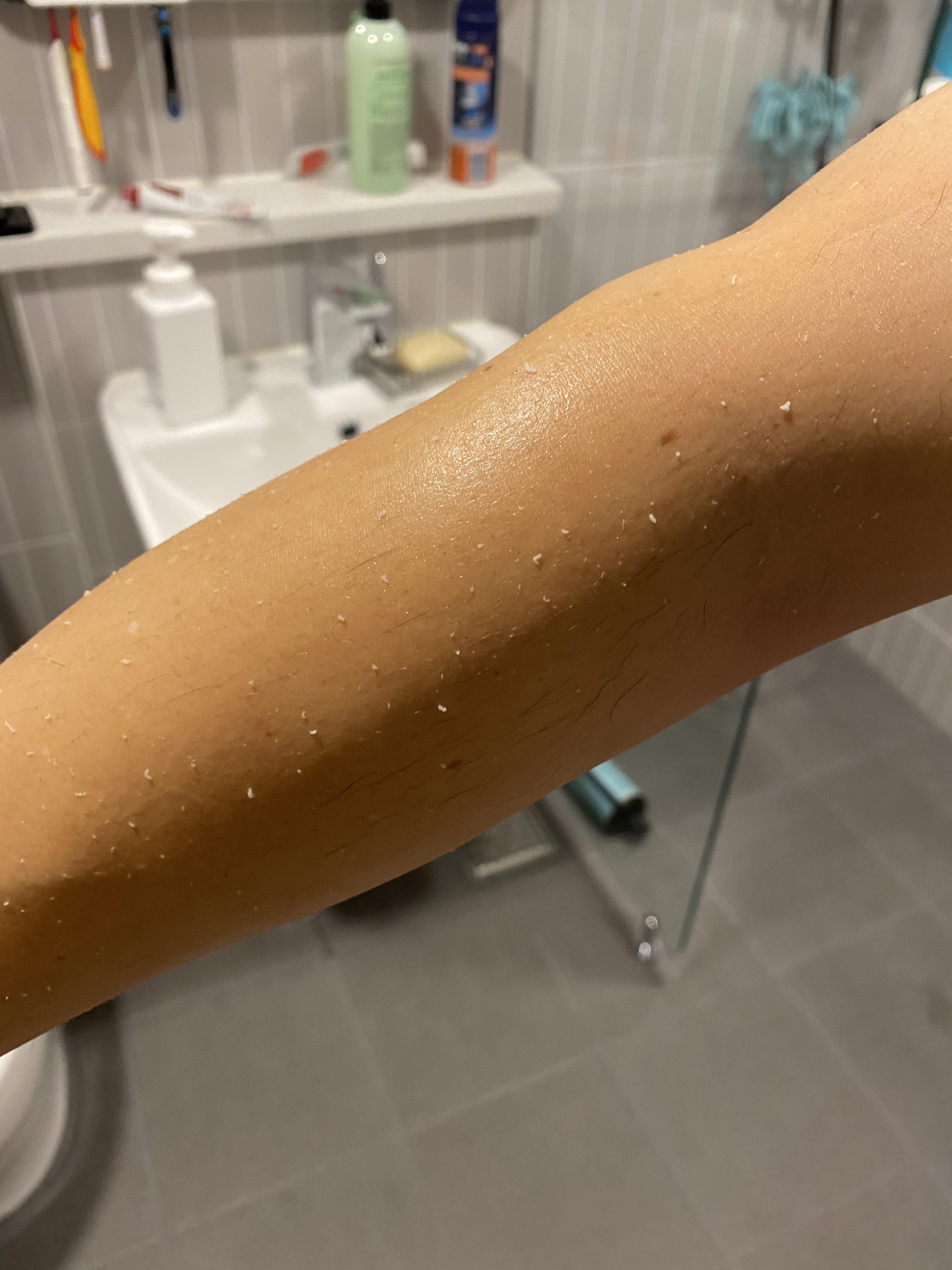 슥슥슥~ 이게 뭐지? 각질 제거되는 거 맞나? 싶었는데 더욱 가열차게 문질러주니 팔뚝에 있던 각질이 후두둑~~ 흐미~~ 팔에 이렇게나 많이 ???? 너무 많은 상태의 사진은 정신건강에 안 좋기 때문에 그나마 볼 수 있을 정도의 사진으로 올립니다. 각질이 많이 나왔다 싶으면 미온수로 싹싹 헹궈주면 끝~~!! 그리고 보습크림으로 마무리해주면 한동안은 각질 볼일 없어집니다. 요 제품보다는 효과가 훠~ㄹ씬 좋은 제품이 있으나 더 이상 시중에 공급이 안되어서 마지못해 대체품으로 온더바디 제품을 구입해 봤는데요, 효과는 나름 만족합니다. 때밀이 수건을 사용 안 해도 각질이 잘 나오니 말이죠^^ 이제 힘들게 각질 제거하지 말고 요 바디필링 제품으로 편하게 각질 관리 해주세용!!