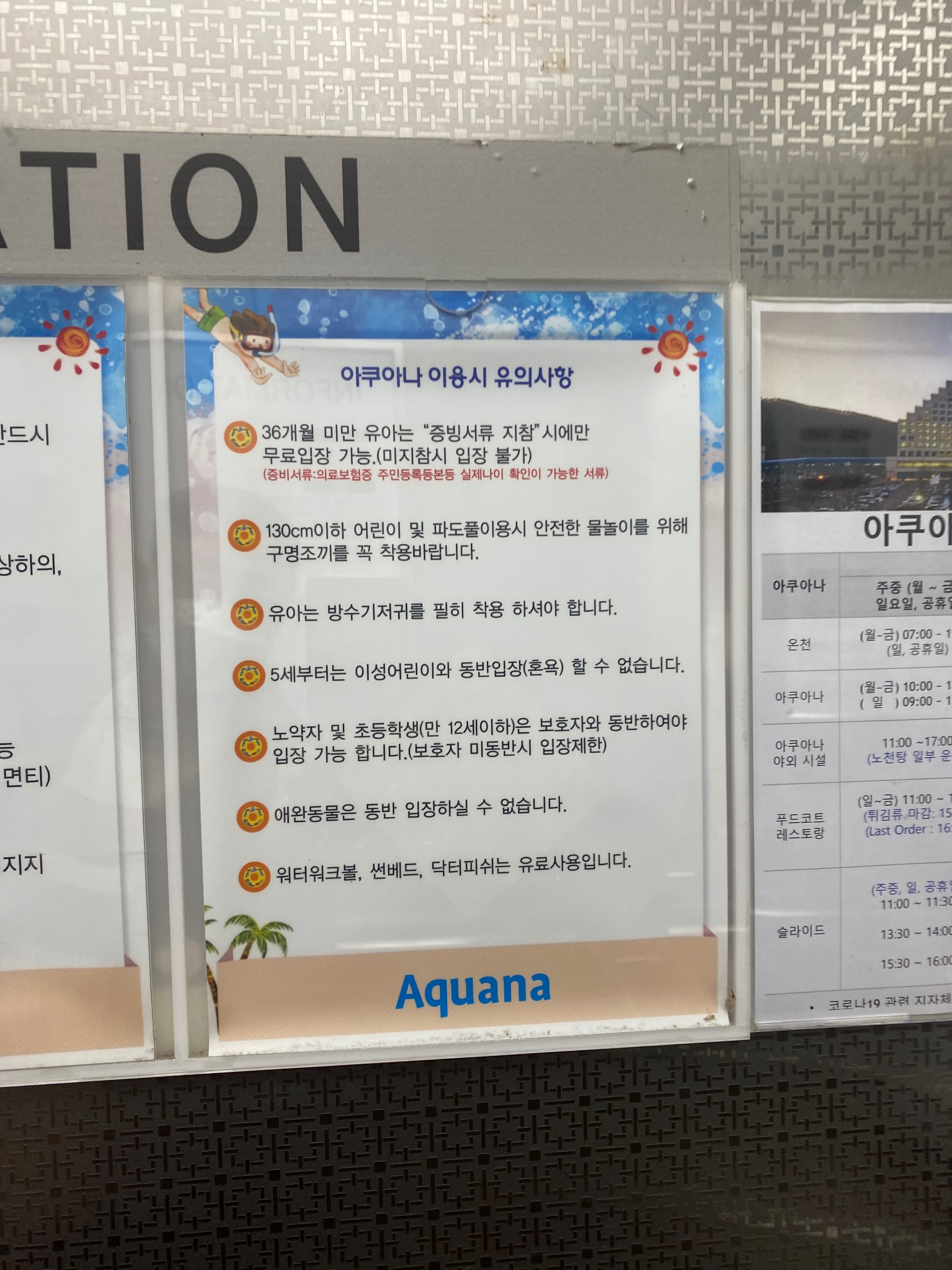 그 외에도 아쿠아나 이용 관련 안내문들이 몇 장 붙어 있었는데 중요한 건 12/31까지 티켓 할인 판매 기간이었다는 거~~ 암튼 쿠팡이 젤 싸겠지 싶어서 현장 판매가는 물어보지 않았습니다.