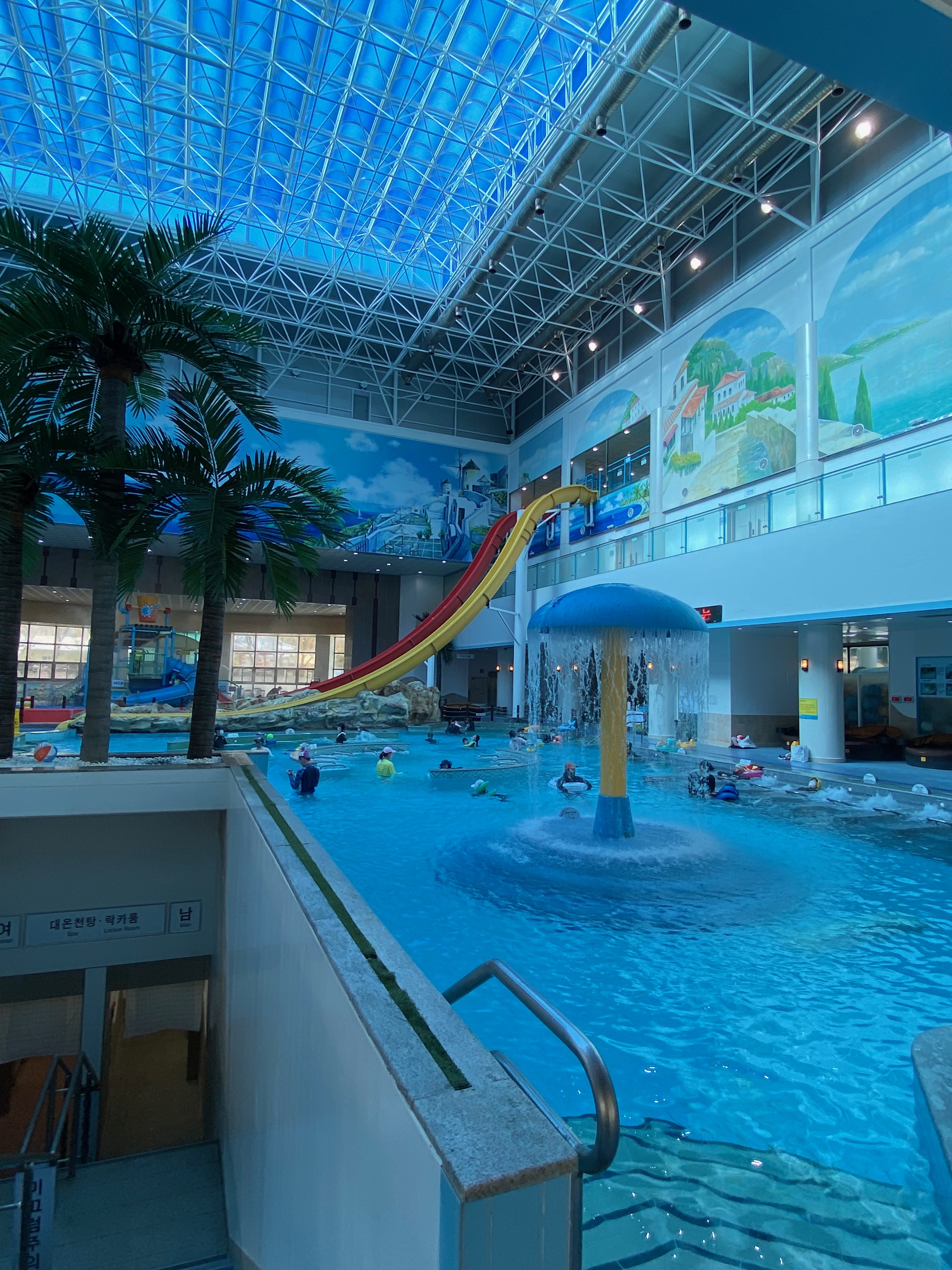 저 멀리 지상 2층에서 아래로 떨어지는 물 미끄럼틀이 보이네요. 7살 아들이 22년 여름에 김해에 있는 롯데 워터파크를 다녀와서 그때 제대로 유수풀 맛을 알아버렸는데 아쉽게도 이렇게 드넓은 실내 수영장에 유수풀이 없어서 좀 실망을 했답니다. 대부분 마사지 풀로 되어 있고 아이들이 놀 거리로 만들어진 곳은 징검다리 건너는 정도랄까? 물 미끄럼틀은 상시로 운영이 되는 게 아니라 하루 네 번 정도 운영이 되고 한 번에 딱 30분간 무료로 즐길 수가 있습니다. 저희들은 오후 3시 30분 타임을 기다려야 했고요 아들은 당연히 신체조건 미달로 암것도 못탔고요 엄마는 무서워서^^ 그래서 아빠만 신나게 물 미끄럼틀을 즐겼네요. 그날 아쿠아나 이용객들이 별로 없어서 아주 쾌적한 환경에서 오후 물놀이 시간을 즐겼습니다. 나중에 알게 된 사실인데 입장료를 한 번만 내면 사우나까지 한꺼번에 다 이용할 수 있었습니다. 아쿠아나는 오후 여섯시까지 딱 운영이 되고 사우나는 더 오랫동안 운영이 되는데 사진 촬영은 금지되어 있어서 담질 못했는데 사우나 시설도 탕이 여러 개가 있고 넓어서 여기도 무척 쾌적하게 즐길 수 있었습니다. 하루의 마무리를 온탕에서 땀을 뻘뻘 흘리며 피로를 싹 풀고 나왔지요. 화순 여행을 계획 중이시라면 여기 금호 아쿠아나도 강추해 봅니다. 편의점도 리조트 쪽에 있어서 숙소 복귀전 간식거리 먹거리를 편하게 볼 수 있는 장점도 있습니다. 금호 아쿠아나 강추!!!