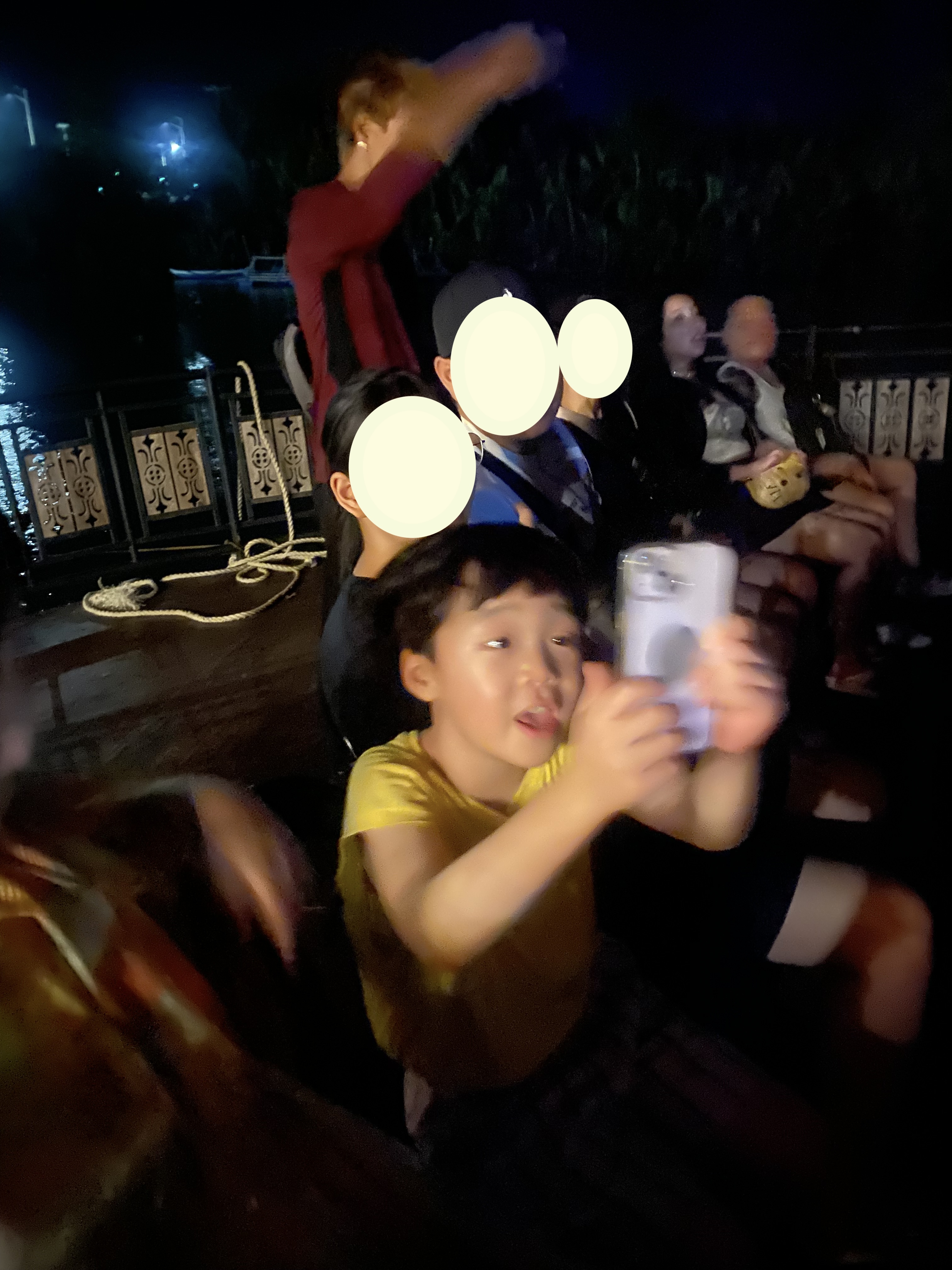 본격적인 배를 타고 강을 내려가는데 빛은 사라지고 깜깜한 밤이 되면서 우선 하늘에 별들이 투어에 참여한 사람들에게 놀라움을 선사합니다. 맑은 하늘에 주변 빛이 사라니 지 하늘에 무수히 많은 별들이 소싯적 군 생활에서 바라봤던 많은 별들을 다시 한번 볼 수 있게 되더군요. 한참을 그렇게 하늘만 보고 가다가 반딧불이가 모여있는 포인트에 도착을 하는데~ 하늘에서 움직이는 작은 불빛들이 포착됩니다. 아들이 급 흥분 모드 발동!! 엄마의 핸드폰을 쥐면서 캄캄한 밤하늘을 향해 열심히 셔터를 누릅니다.